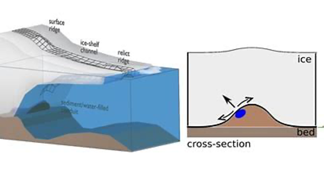 这些山脊被称为“蛇丘斜坡”(rampas eskers),(蛇丘:由冰川融化后留下的沙砾和土形成的狭长脊)。它们比人们预期的要大得多,因此能够向上穿破冰层,从而割裂冰面,产生一条条的“冰沟渠”。
